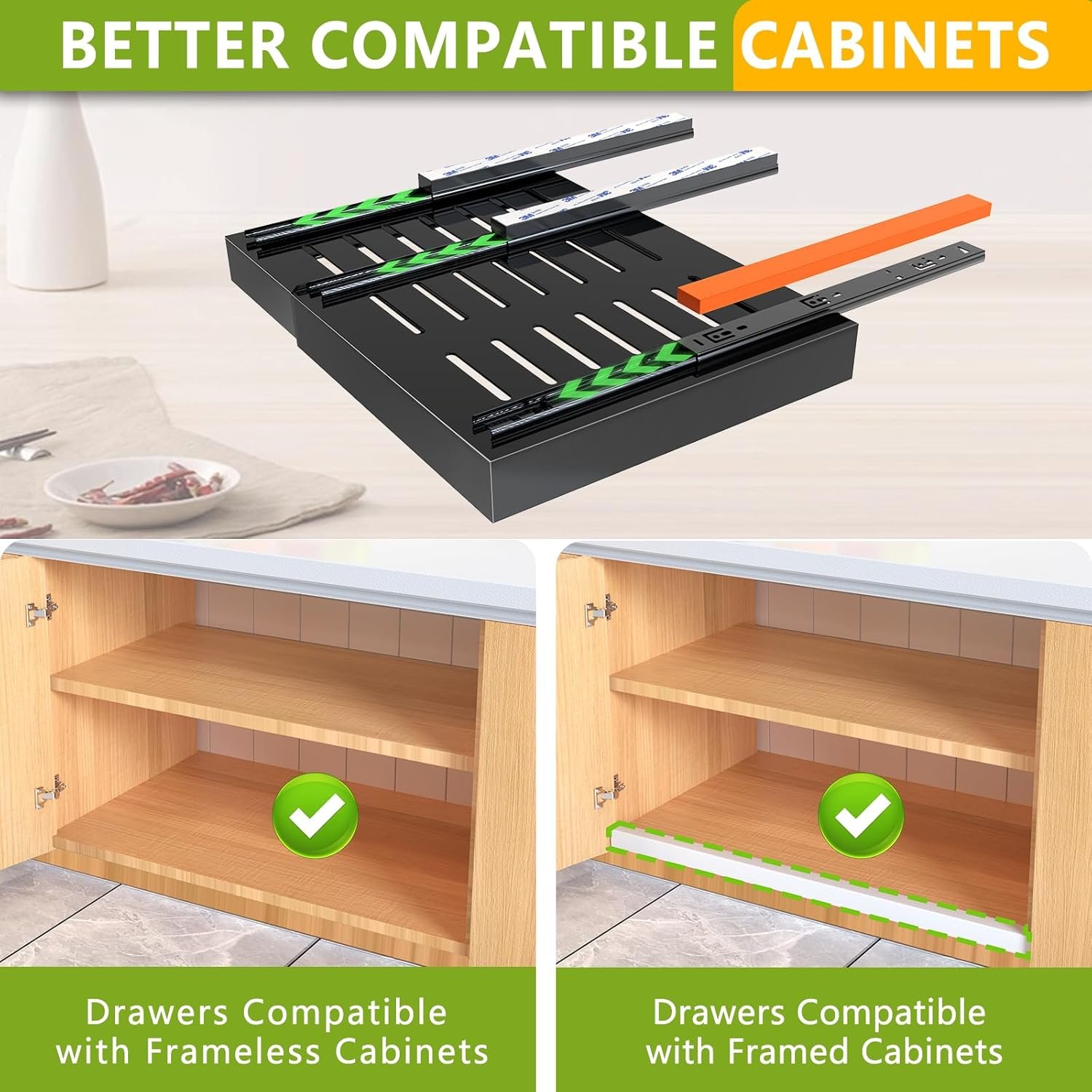 Compatible Framed cabinets:If your are Framed cabinet , please don’t worry. We have upgraded 3 roots height-enhancing pads. You only need to use nano glue to stick it to the rail to solve the problem that your cabinet cannot slide due to the edge of the counter