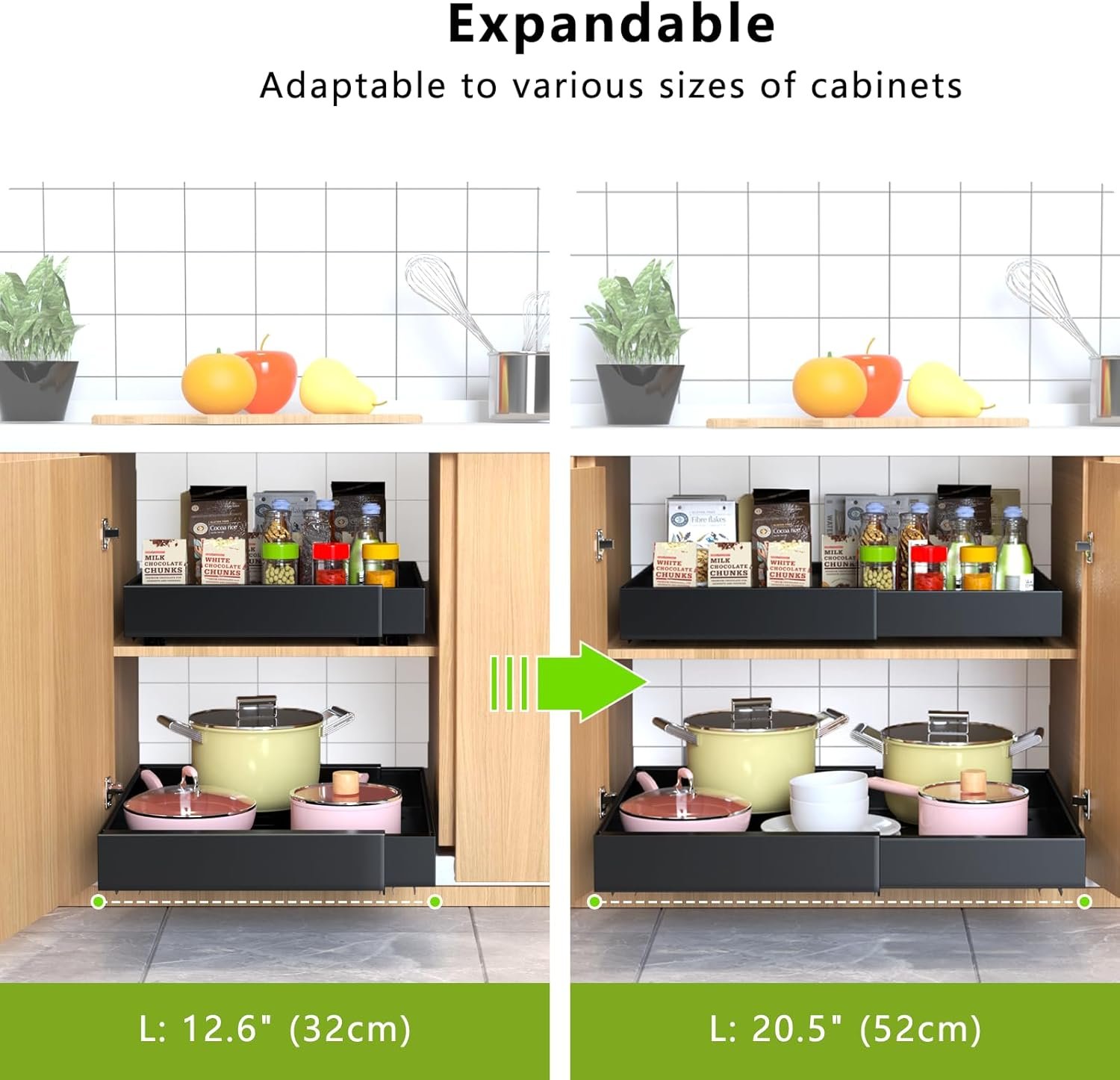 Expanble Pull Out Organizer: Pull out cabinet drawer organizer with an extendable design can be adjusted to fit different kitchens cabinets,It measures 21″d *3″h featuring an adjustable width range from 12.4 inches to 20.47 inches. This customizable design ensures compatibility with any cabinet size, offering tailored storage solutions for pots, pans, bowls, spices, cleaning product,canned goods, and more.