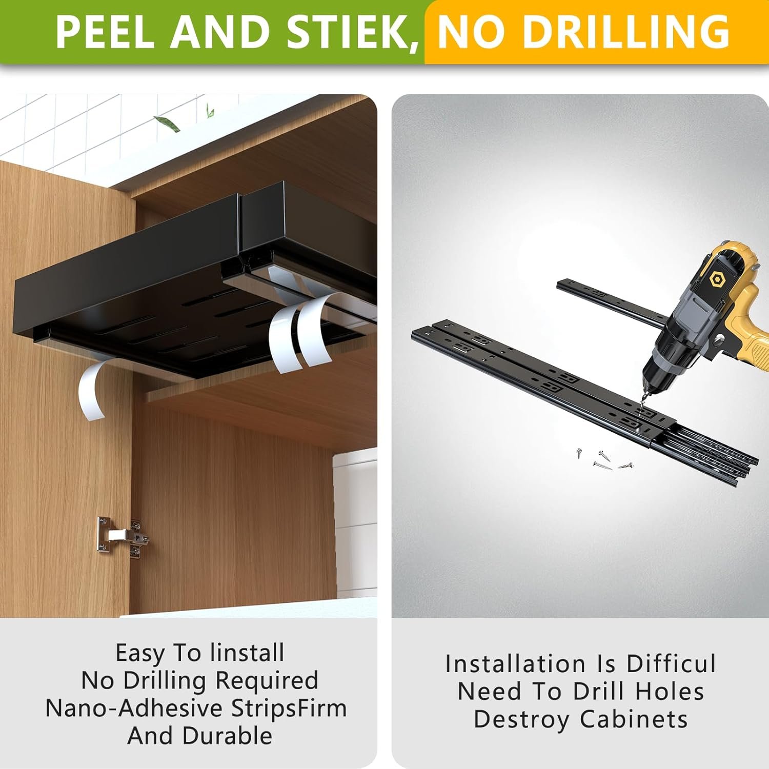 No Drilling Required: Our pull out expandable cabinet organizer is very easy to install, no drilling or screwing required. It comes with 3 strips of 3M adhesive tape and can be installed directly with the tape.Perfect for your kitchen, Bathroom,living room,office,and more.Ideal pantry storage organizing.