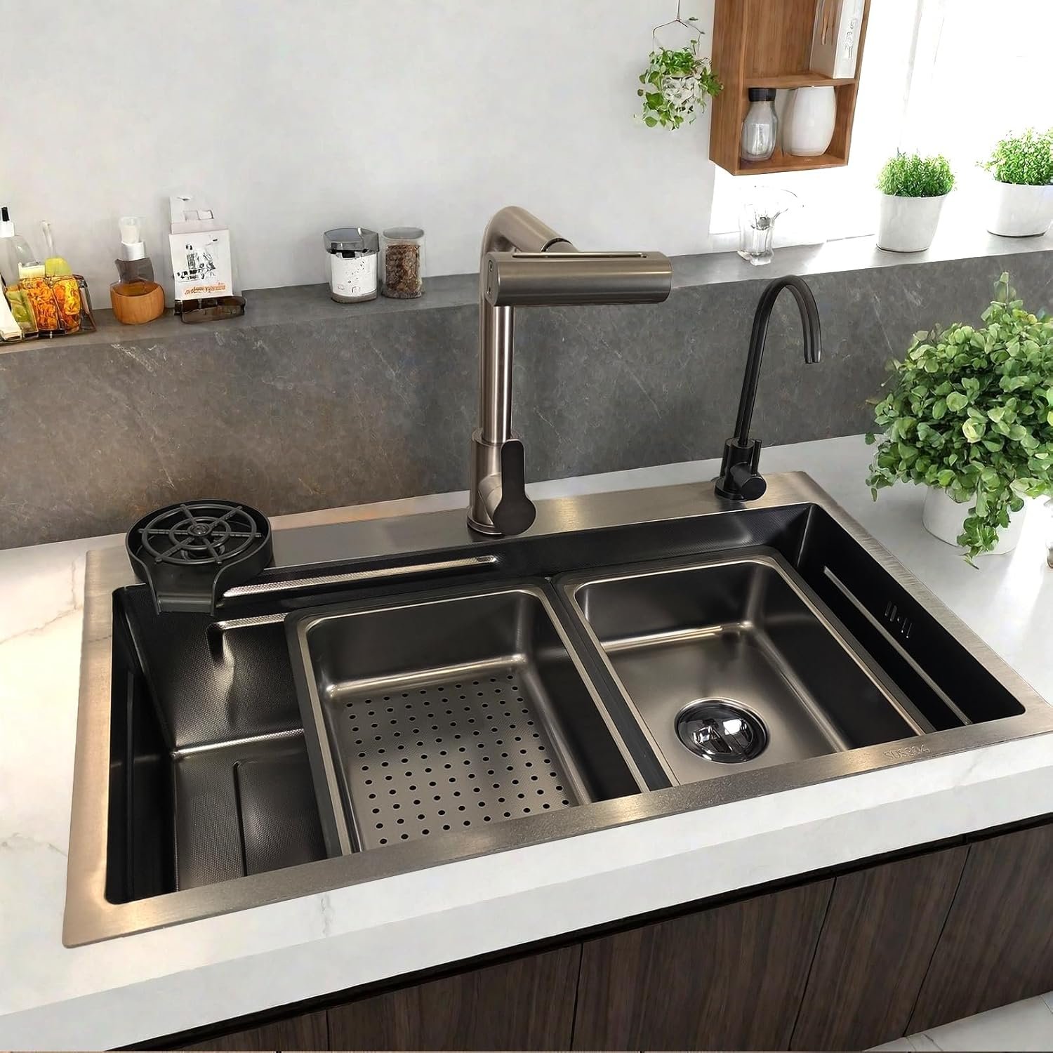 Comprehensive Sink Set: Experience the ultimate in kitchen convenience with our comprehensive sink set. Designed to enhance your culinary workspace, this set includes a spacious main sink, a secondary sink, a colander, a cutting board, a four-function pull-out faucet, a glass rinser with accessories, a water filter faucet, and all necessary hoses and valves. Everything you need to streamline your kitchen tasks is included.