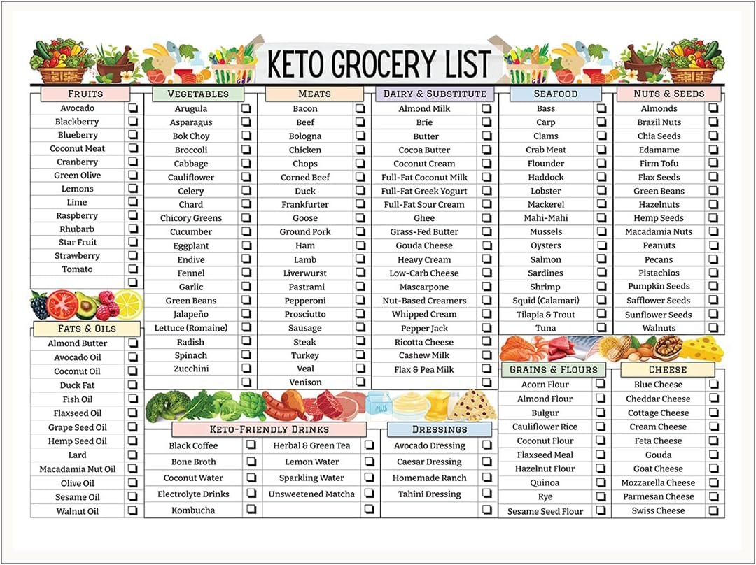 Grocery List and Portion Control Visuals – Features a diabetes-friendly grocery list and categorized food items (low-carb, high-fiber, healthy fats) to support practical shopping habits and meal prep at home.