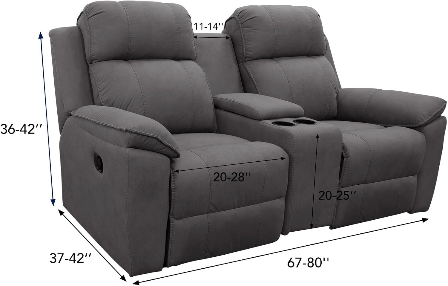 DIMENSIONS: Fit Reclining Loveseat with Middle Console 67-80″ W x 36-42″ D x 37-42″ H, Fit 1 Seat Width 20-28″ Seat depth: 20-25″ Console width: 11-14″ Console depth: 36-42″