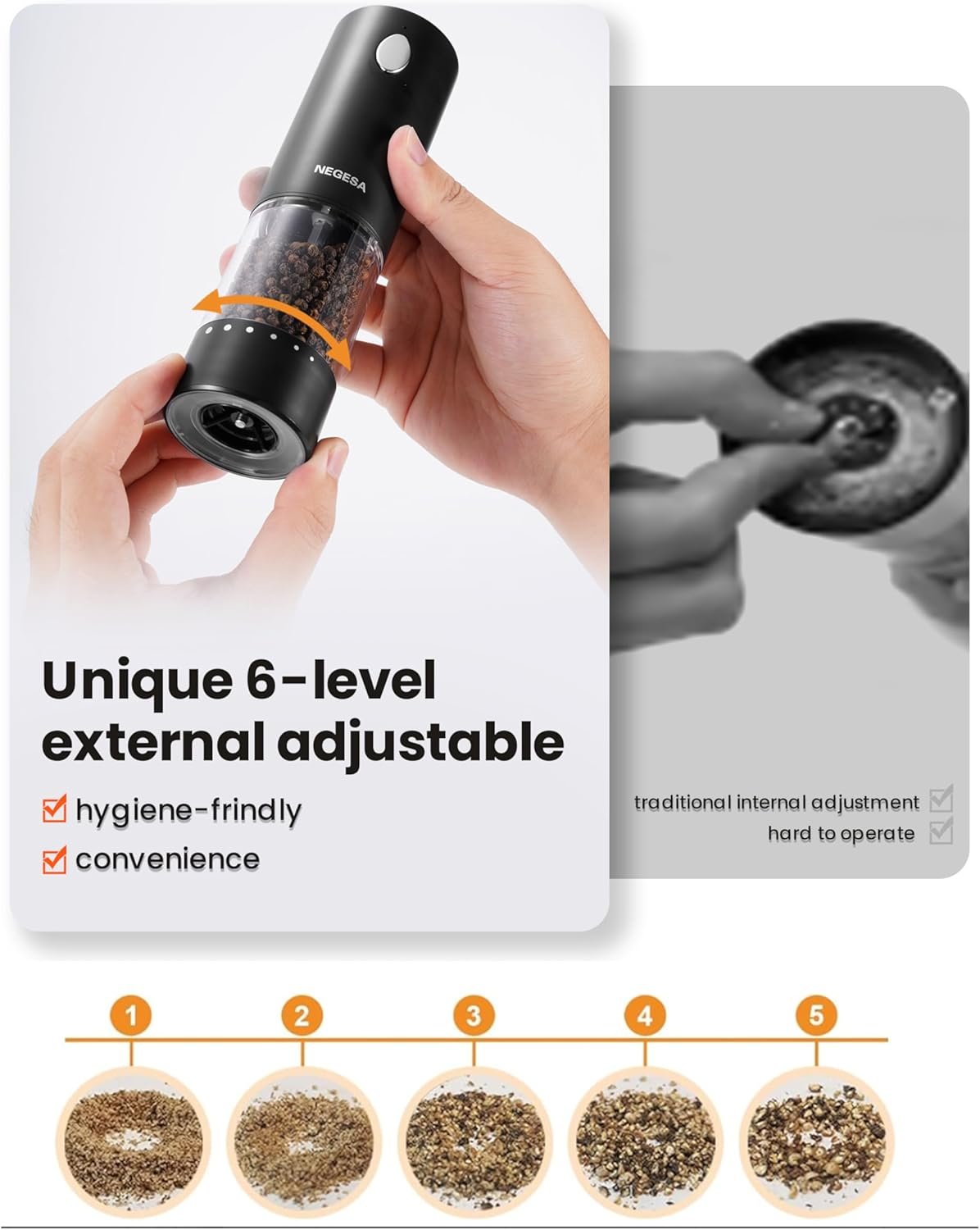 6-Level Customizable Grind Coarseness: Tailor your seasoning to perfection with 6 precise grinding settings, from ultra-fine powder to coarse flakes. Ideal for everything from delicate sauces to bold BBQ rubs, ensuring the perfect texture for every dish