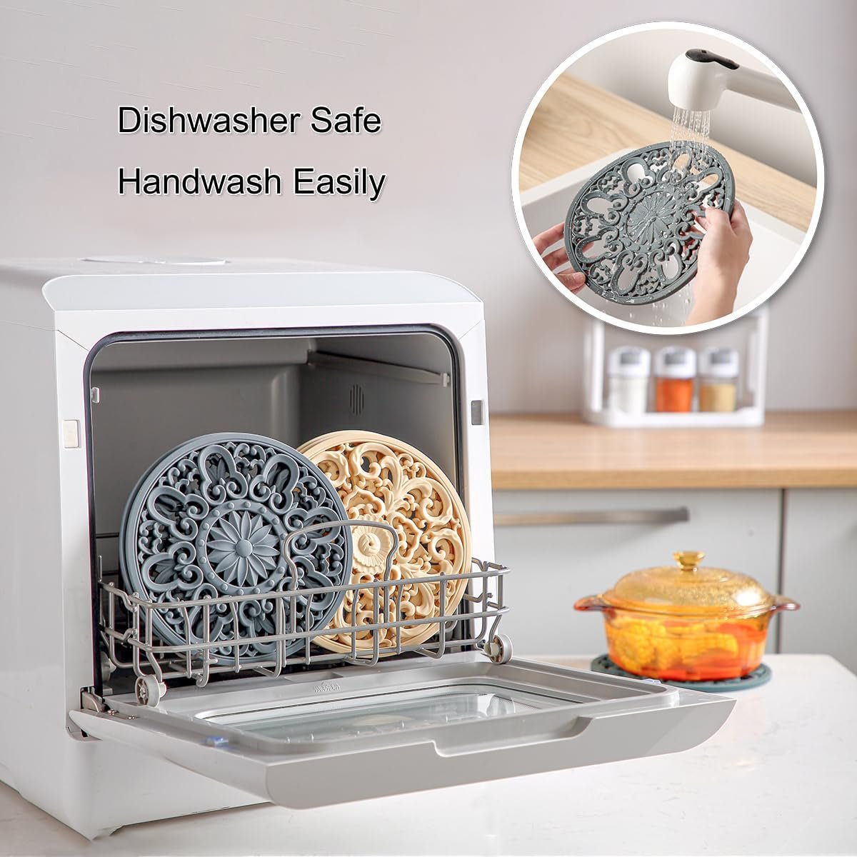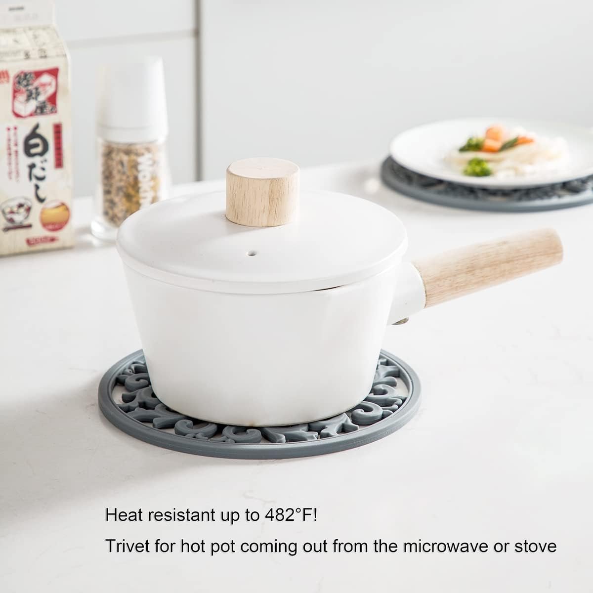 Dishwasher Safe: Simply hand-wash our trivet silicone or put it into the dishwasher. Virtually everything washes off the nonstick surface with ease—even sticky foods.Oven Safe and Microwave Safe: The trivets are heat resistant up to 482°F! Protect your countertop or table from hot pot, hot dishes coming out from the microwave or stove.Non-Slip: Nothing that sits on top of them is going to slide off because of their grip.