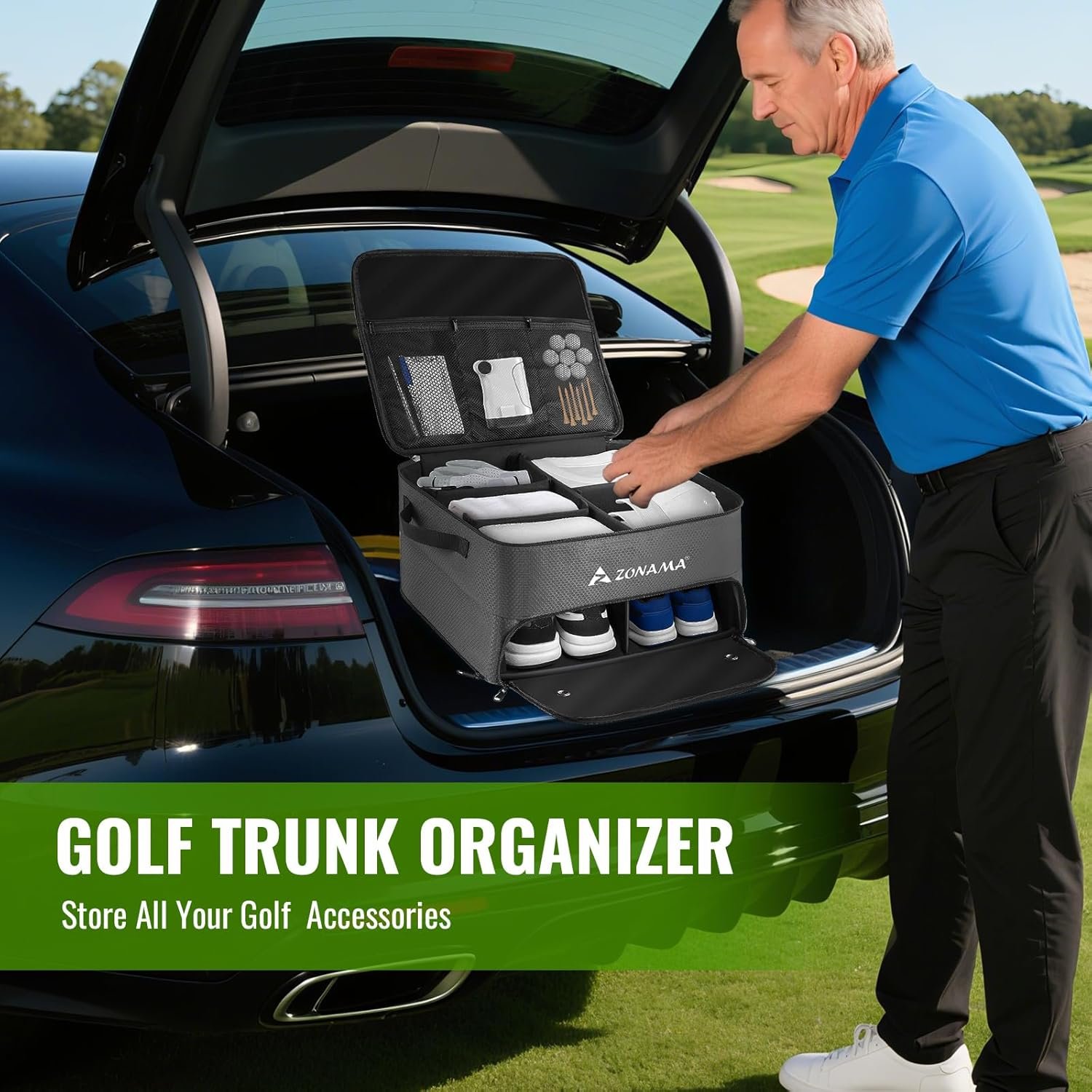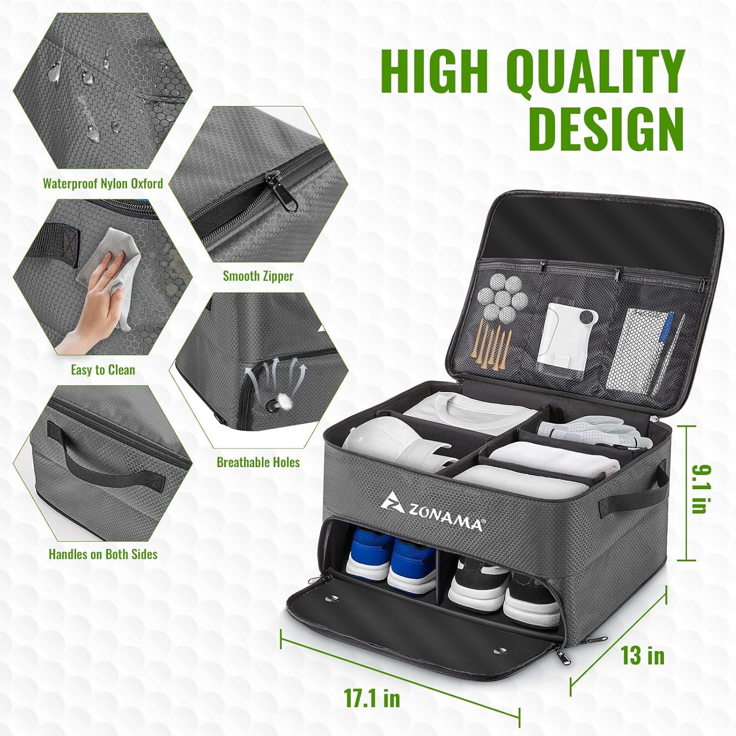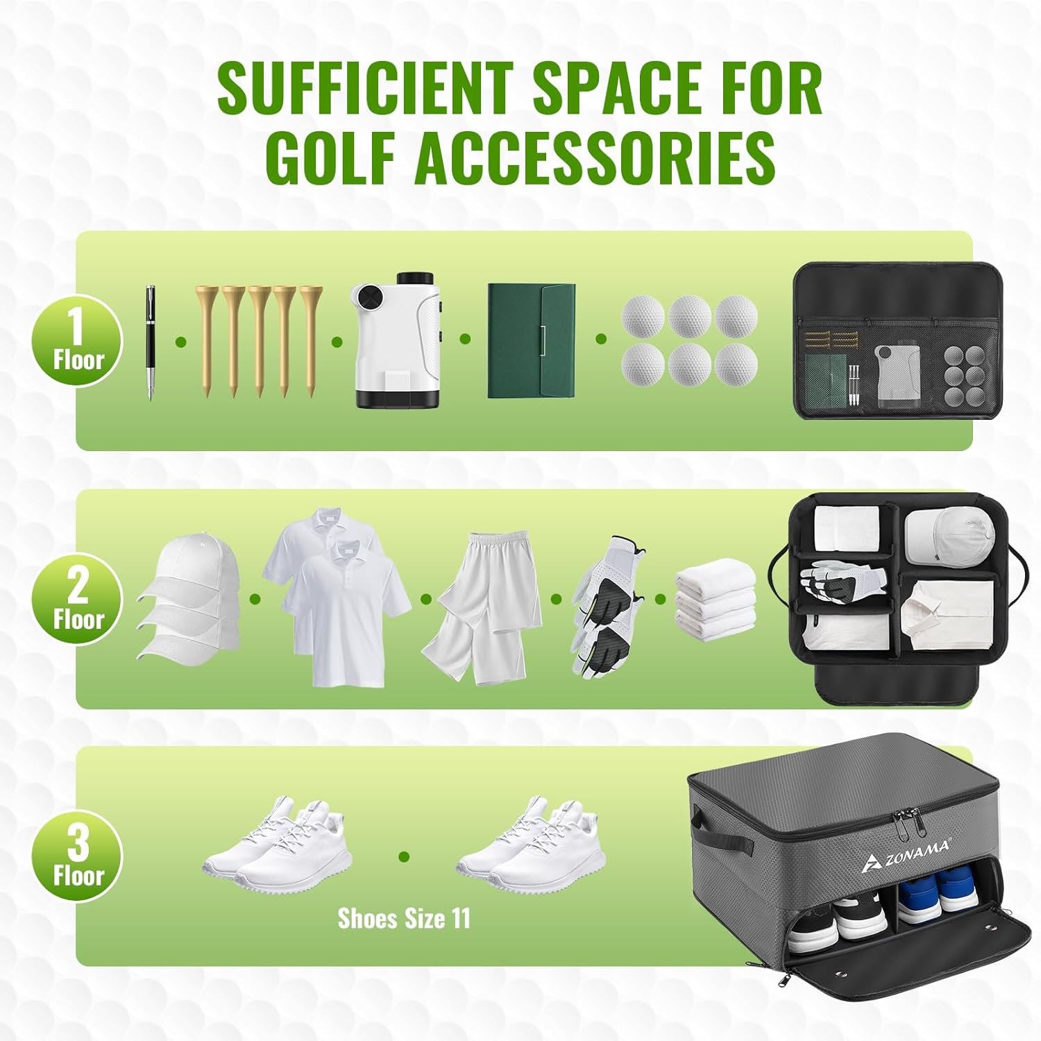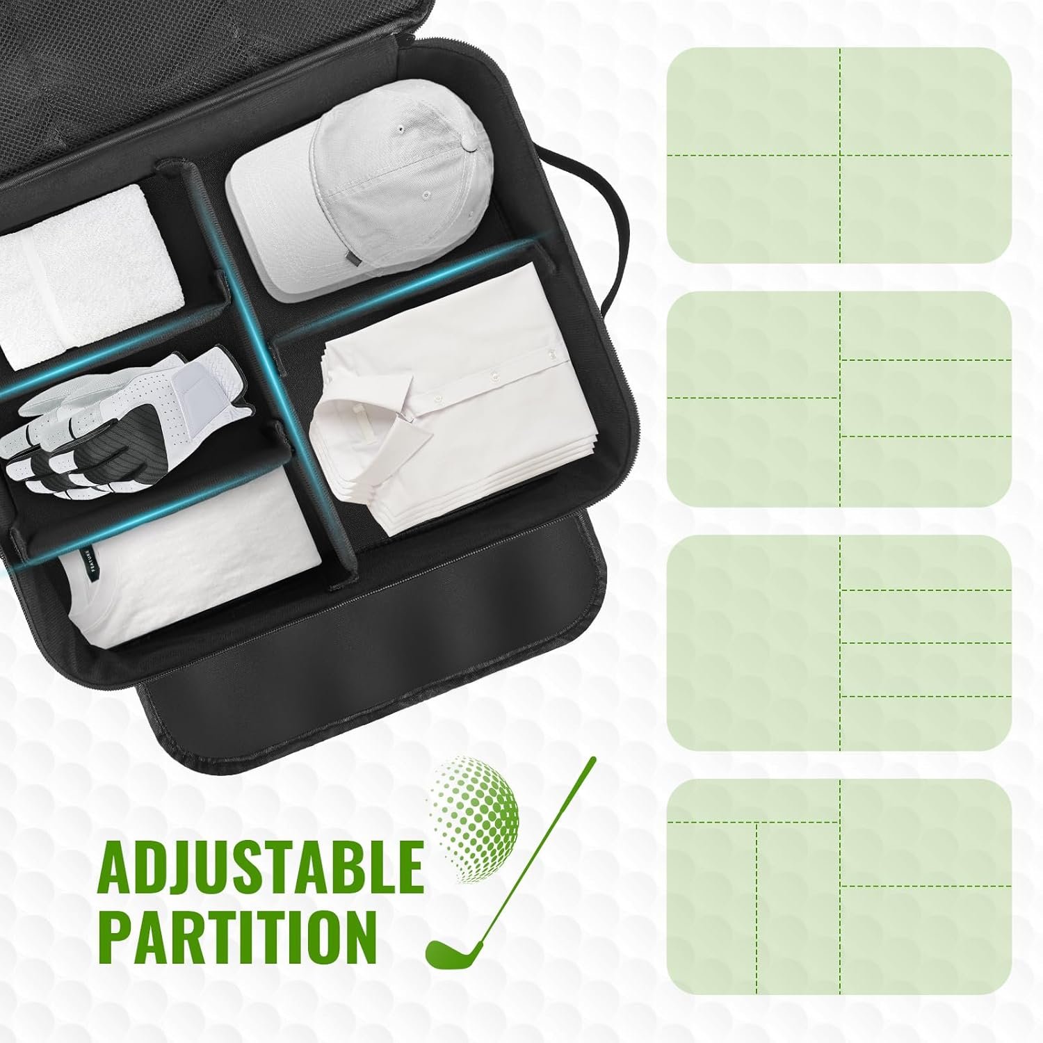 Adequate Storage Space: The golf trunk organizer has 3 layers. The bottom layer consists of two independent compartments that can accommodate two pairs of shoes under size 11, and it is designed with 2 air holes to keep the shoes ventilated. The middle layer has 5 adjustable compartments, which can store golf shirts, hats, gloves, towels, etc., and you can adjust the size of the partitions freely. The upper cover is designed with 3 compartments, which can hold golf balls, tees, pens, etc.