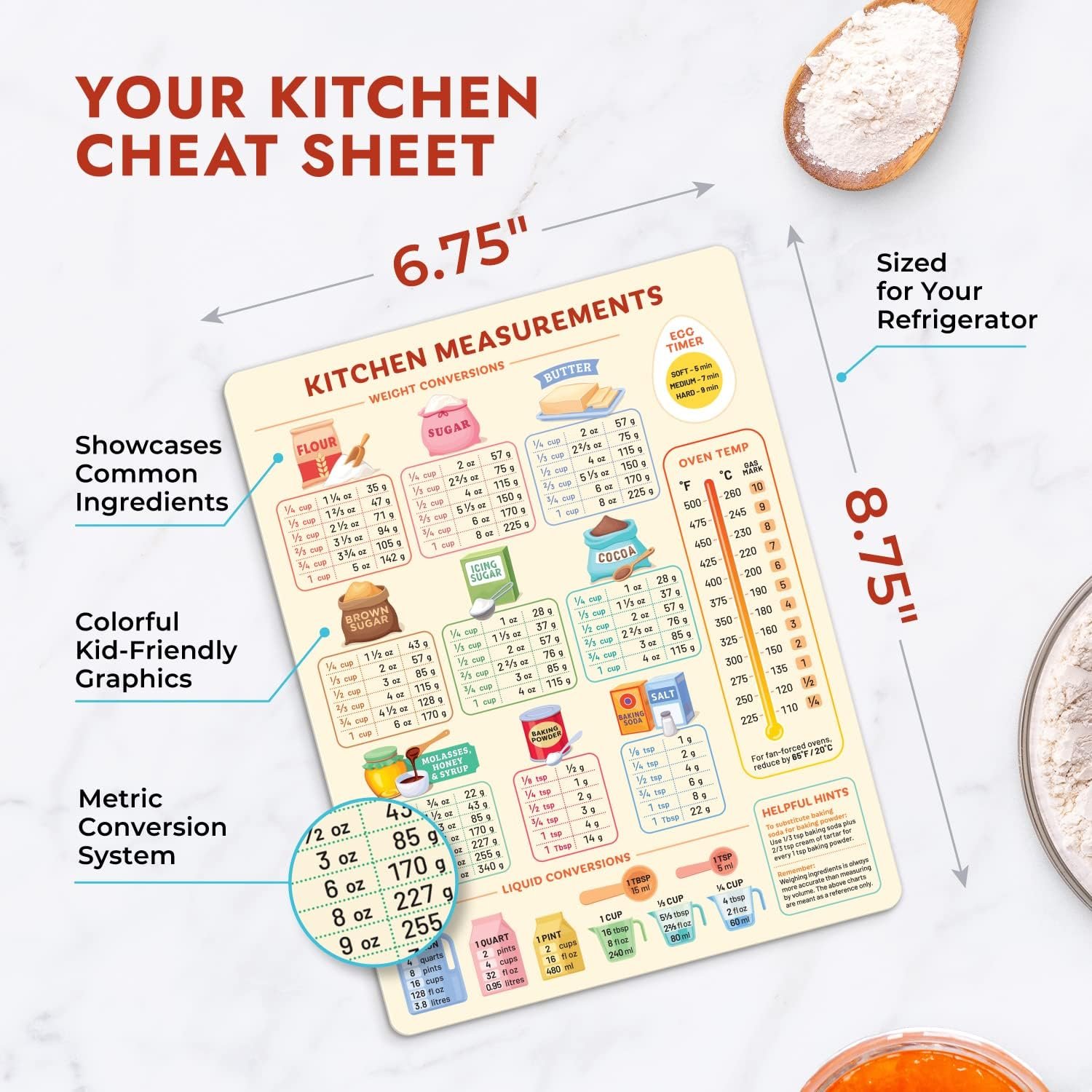 Don’t resort to rough estimates and risk a flattened souffle or a sauce with unbalanced flavors. Get the answer to your kitchen needs with one quick look at your refrigerator door.