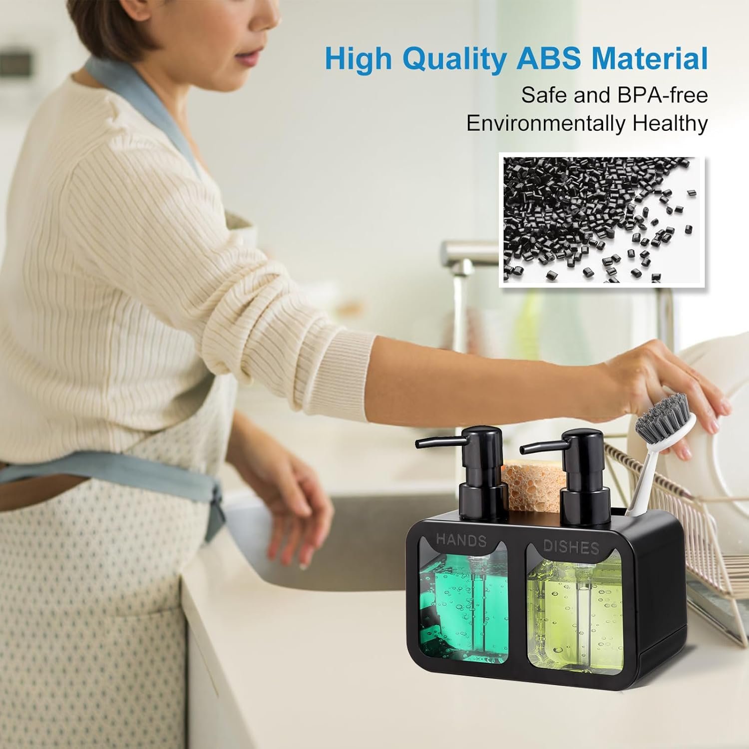 Versatile 4-in-1 Design: This dish and hand soap dispenser set comes equipped with two separate transparent soap bottles, allowing you to conveniently store hand soap and dishwashing liquid simultaneously. It also includes a sponge tray and brush holder, making it easy for you to organize cleaning supplies. This clever design not only enhances kitchen cleaning efficiency but also saves countertop space.