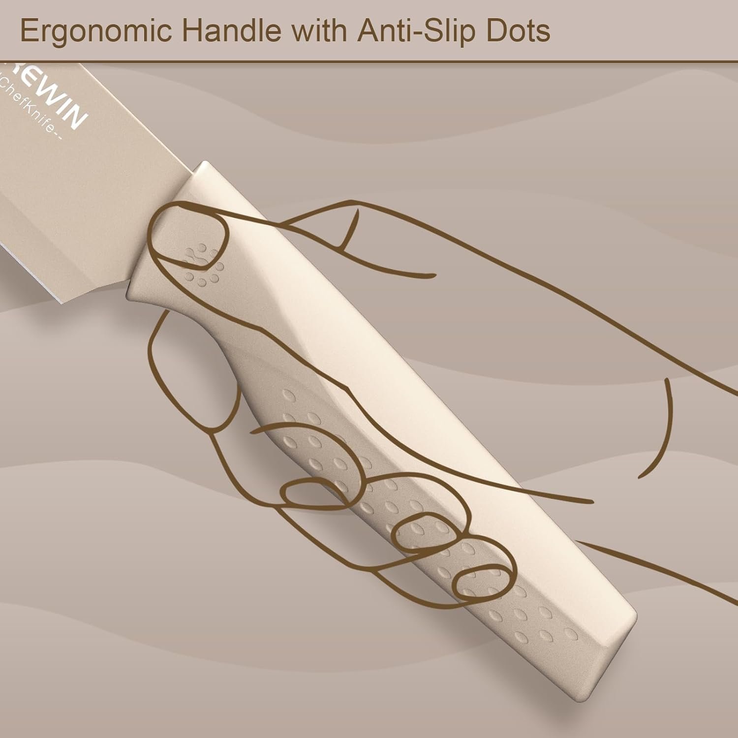 NON-STICK & ERGONOMIC – The black coating on the blade ensures excellent non-stick and rust-resistant properties for our kitchen knives. Our ergonomic knife handle features anti-slip indented dots to ensure a firm and safe grip.
