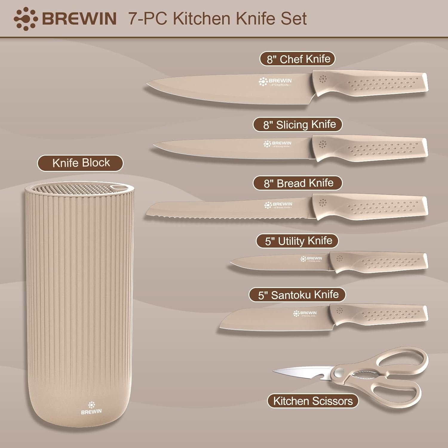 PERFECT ALL-IN-ONE SET – Brewin kitchen knife set includes 1 x 8” chef knife, 1 x 8” slicing knife, 1 x 8” bread knife, 1 x 5” utility knife, 1 x 5” Santoku knife, 1 x kitchen scissors, 1 x universal knife block. Germain 1.4116 stainless steel. Aesthetic design. Brewin knife set meets all your kitchen works.