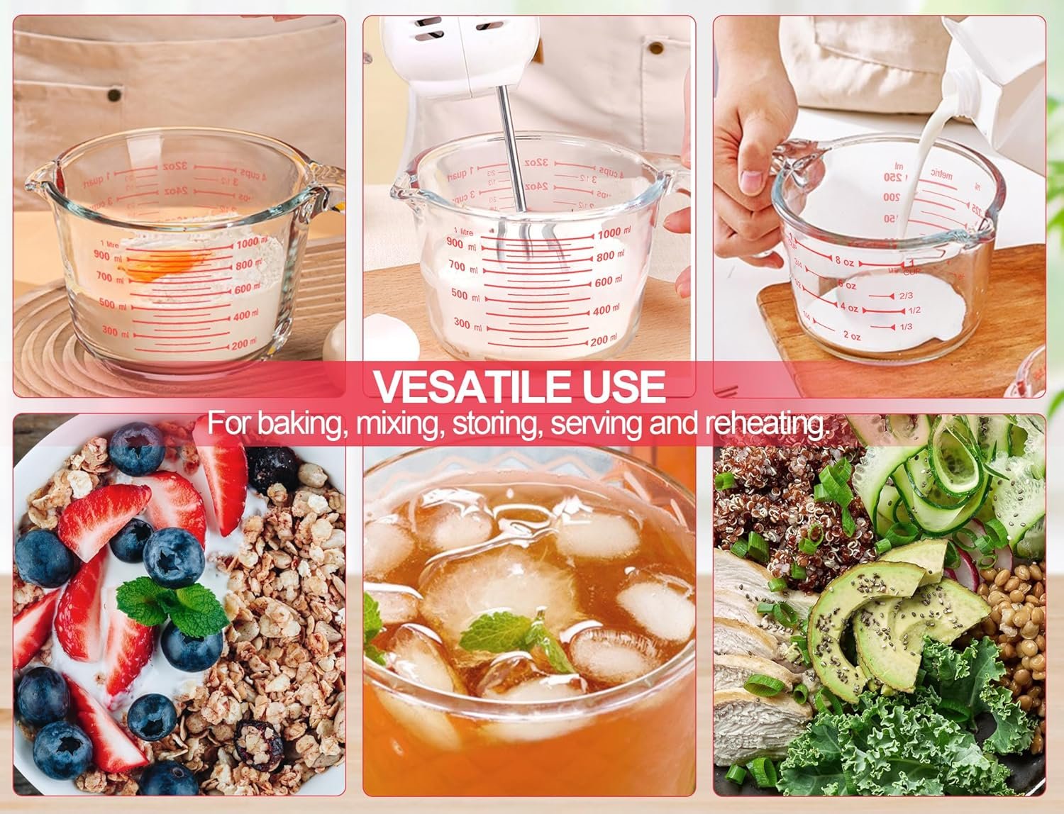 PREMIUM GLASS: Our measuring cups are made of borosilicate glass, can be used in microwave, oven, freezer and top rack of dishwasher. Great for everyday mixing and serving