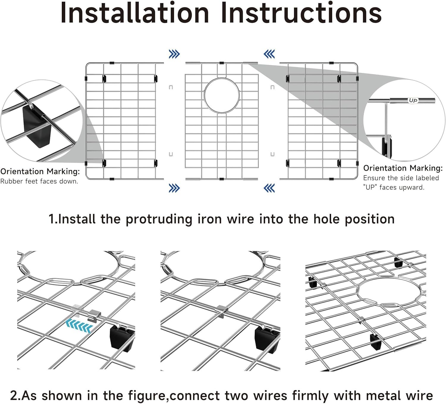 ·Notice: This sink protector is divided into 3 pieces,very easy to combine them,as shown in the video,put the metal clasps down and push it forward to lock them together.It is a detachable sink grid, multifunctional use. ·Notice: Must remove the vinyl feet before placing the sink grid in the dishwasher.