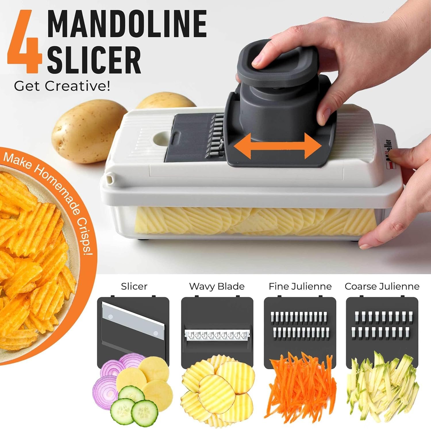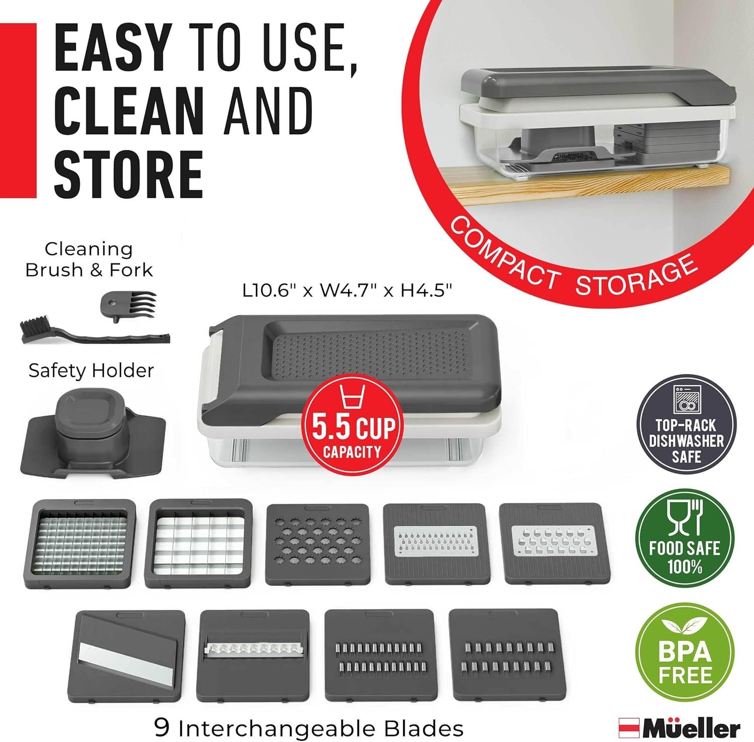 Revolutionize your kitchen experience with this all-in-1 kitchen gadget, combining the functions of a vegetable chopper, mandoline slicer, cheese grater, into one compact and efficient device. The Mueller chopper offers unparalleled versatility with 9 high-quality, interchangeable stainless-steel blades, perfect for dicing, slicing, grating, and chopping all your favorite vegetables and fruits. The included container ensures mess-free prep.