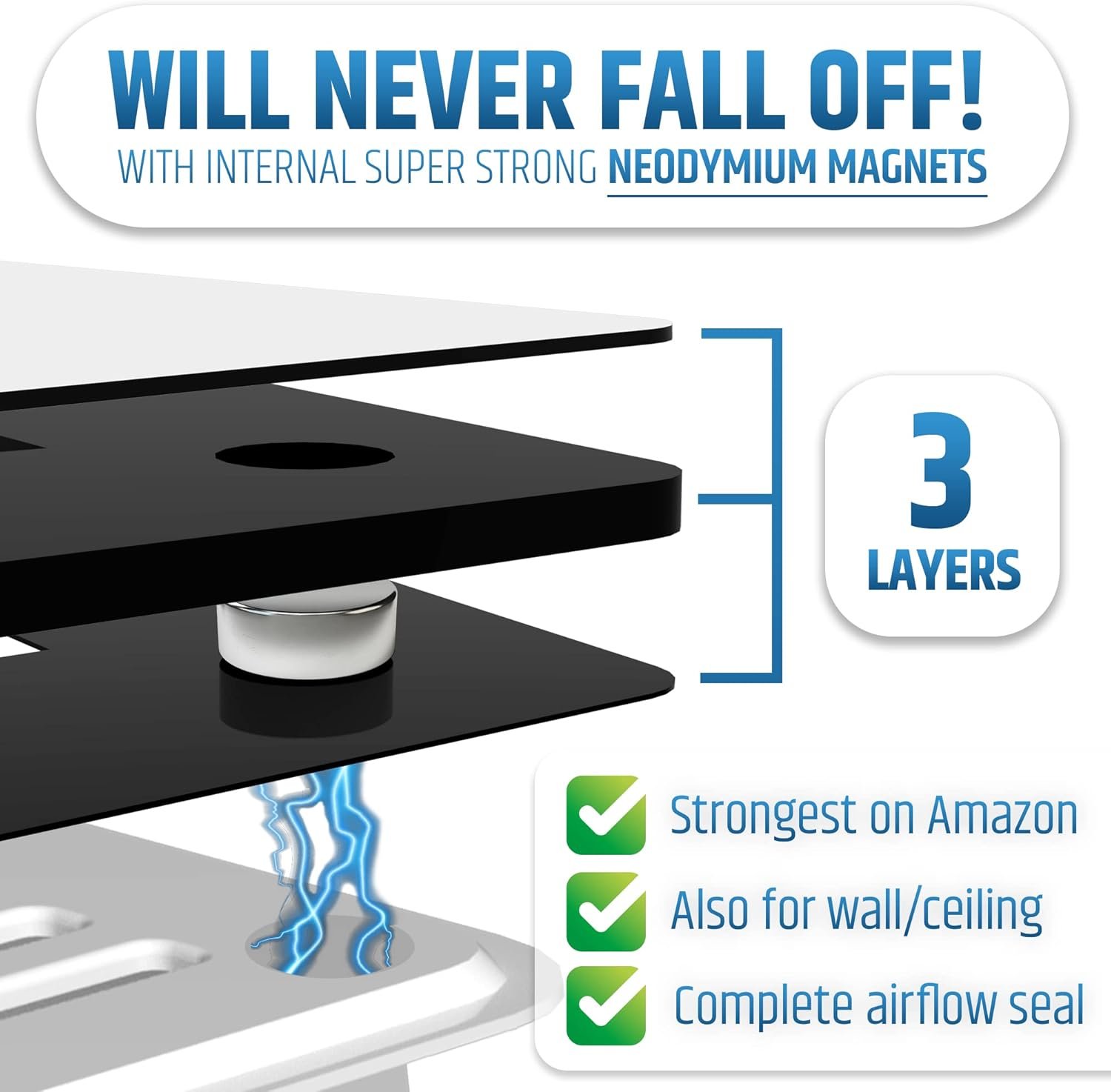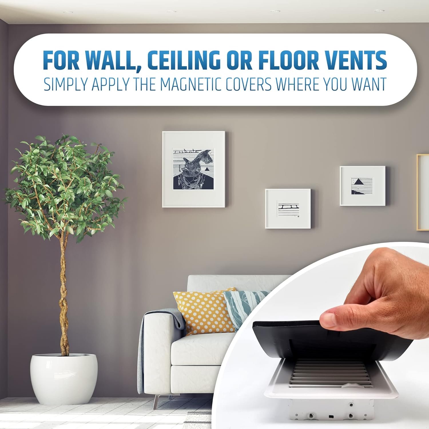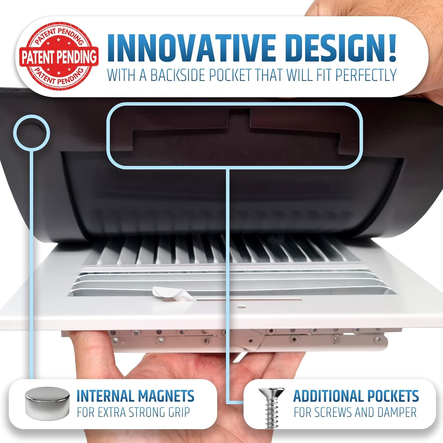 INNOVATIVE DESIGN WITH STRONG MAGNETS: Our patent-pending magnetic vent covers stay secure, even on ceiling vents. Hidden Rare Earth magnets and a backside pocket ensure a snug fit over screws and dampers, keeping the cover in place.