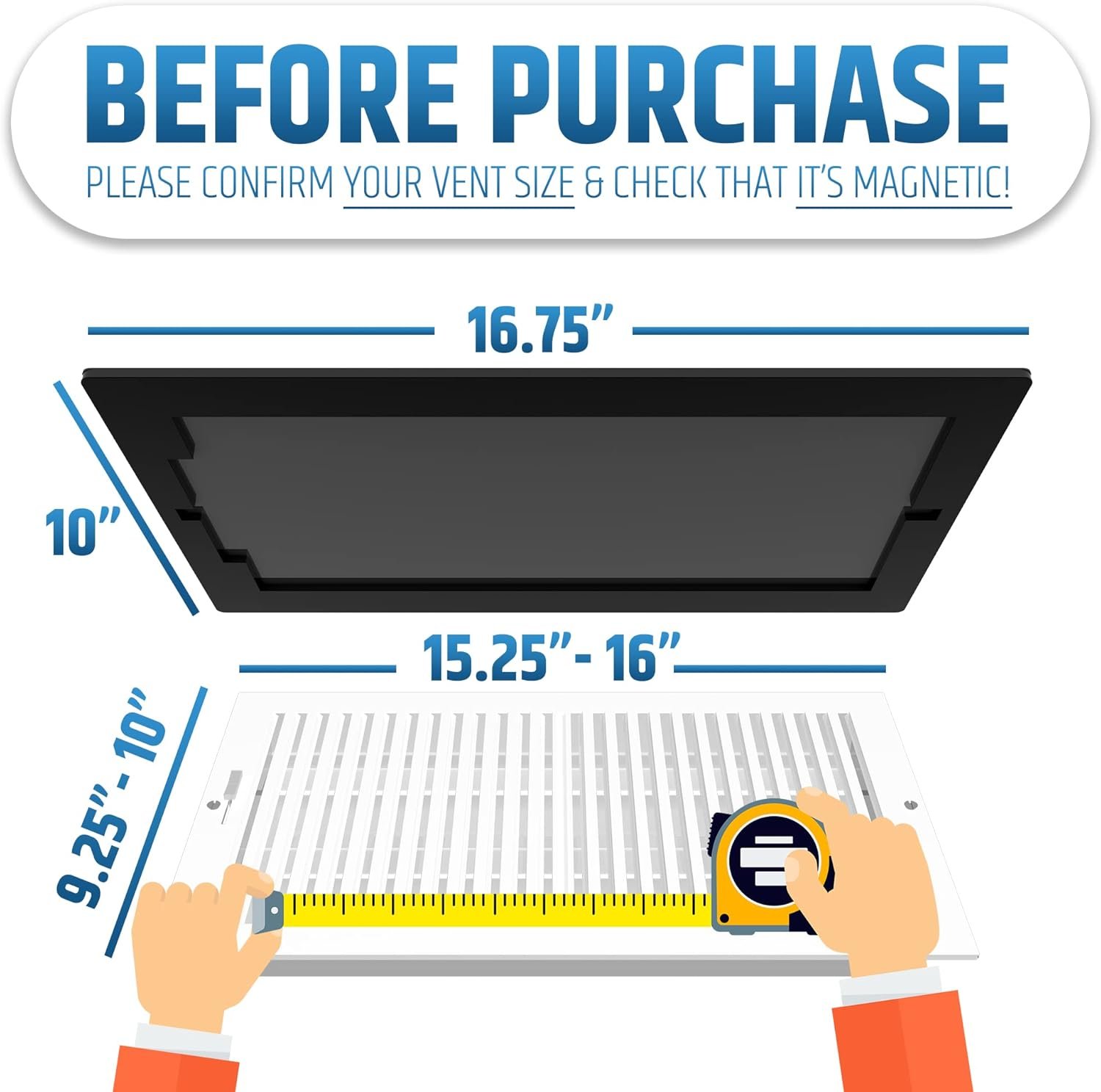 CONFIRM YOUR VENT SIZE & MAGNETISM: Each cover is designed for specific vent sizes with tailored pockets and magnets. First, ensure your vent is magnetic. Second, this cover works on vents with widths between 9.25”-10” and lengths between 15.25”-16”.