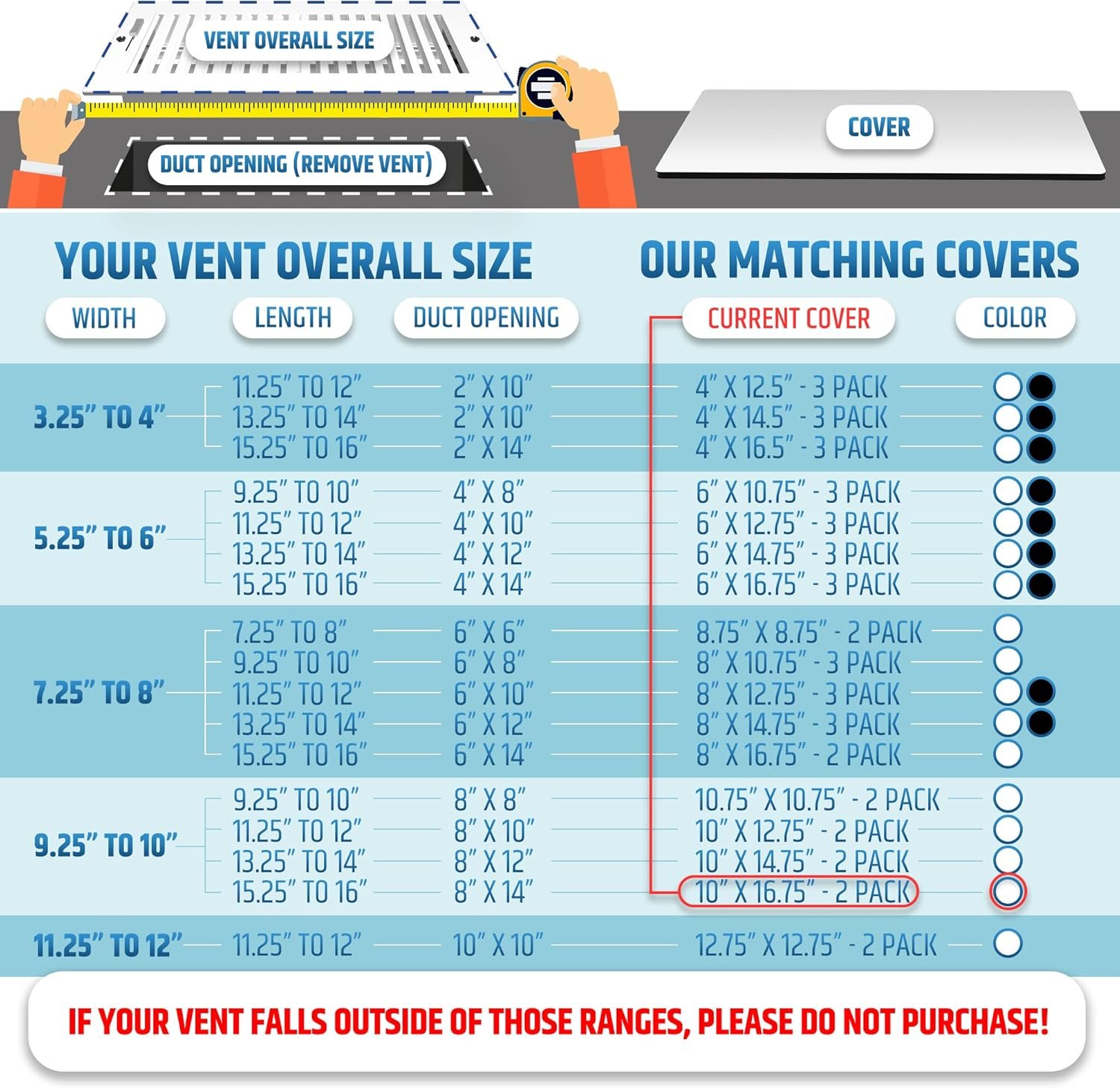 BEFORE YOU BUY – CHOOSE THE RIGHT SIZE: We offer 26 covers in various sizes and colors. Use our size chart to select the correct cover for your vent. DO NOT cut the cover; it may damage its features and won’t work if your vent size is outside our ranges.