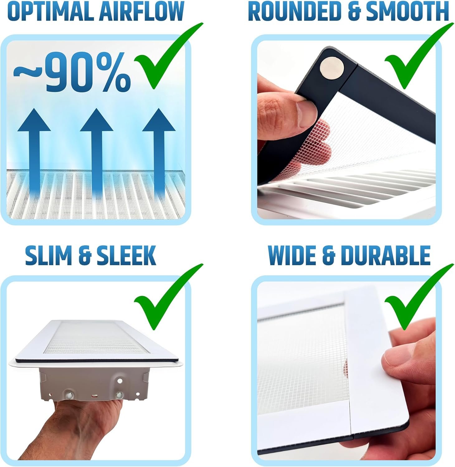 SIMPLE & DURABLE: No installation needed. The wider, stronger frame is built to last. A tight seal prevents kids, pets, and vacuum robots from shifting it easily. Rounded corners and smooth edges make it safe for bare feet. Reusable on any vent.