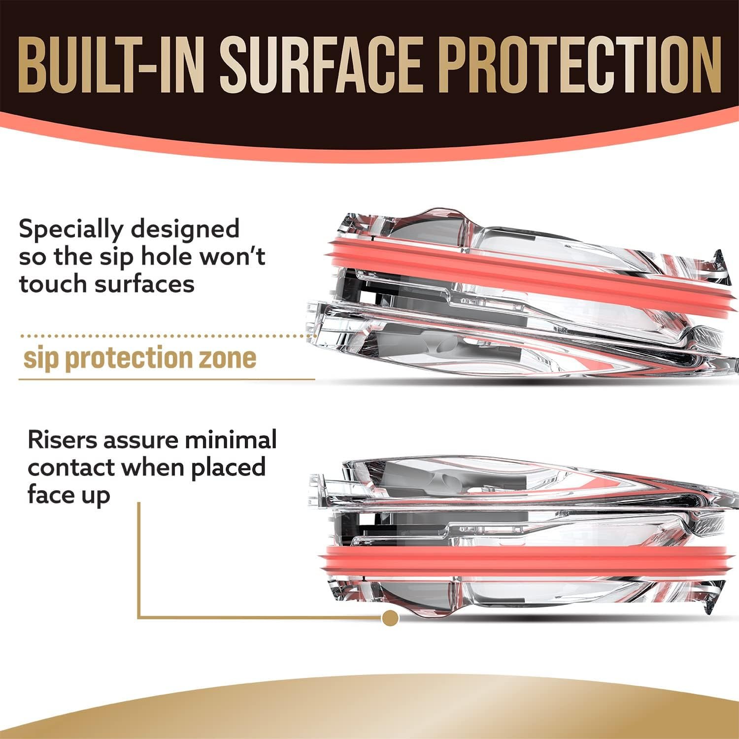 WORRY-FREE HANDLING – Place face-down or face-up without the drinking surface touching the table.