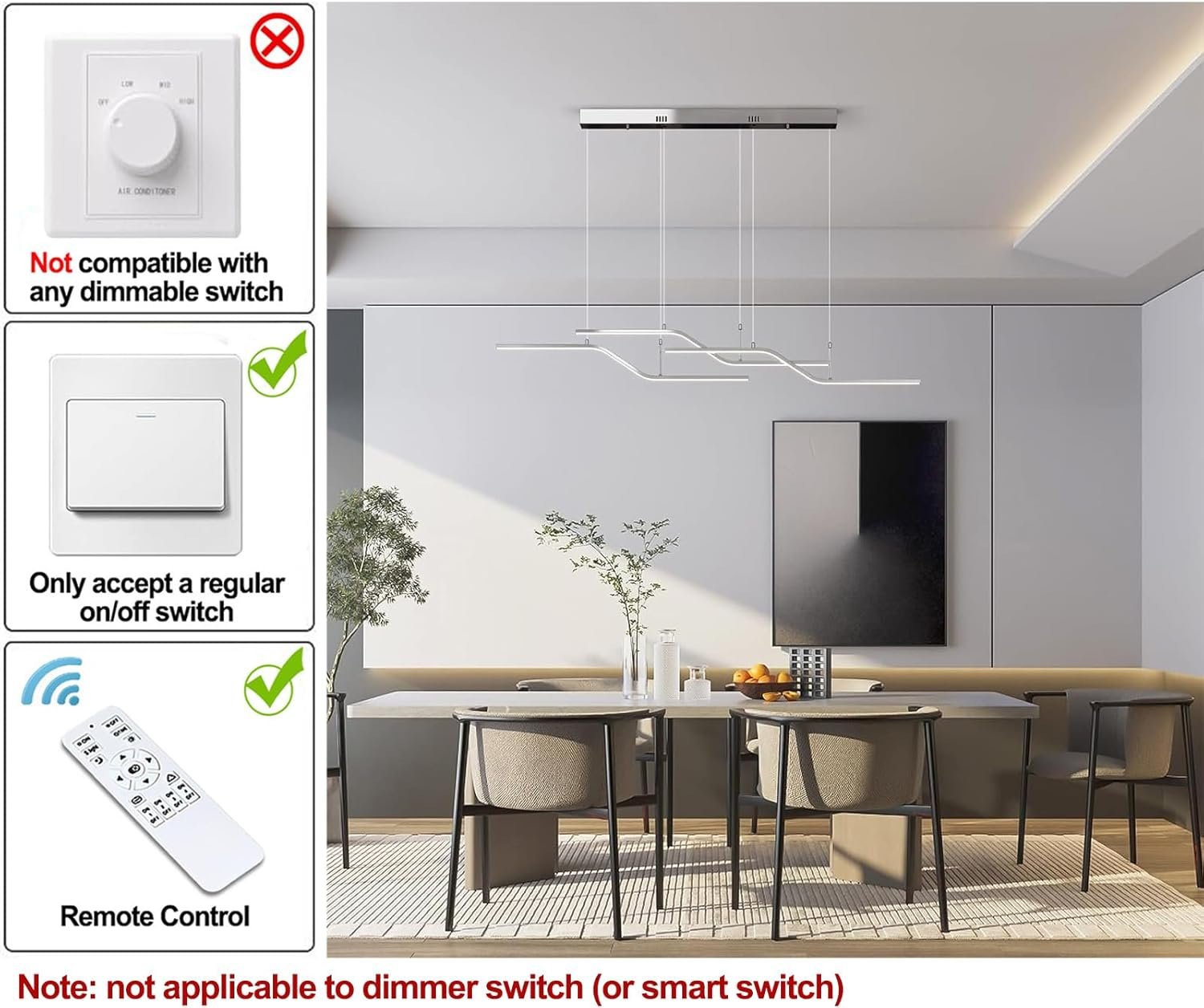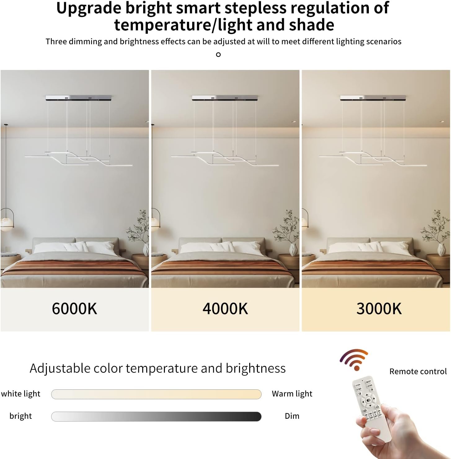 Fully Dimmable with Remote: High quality LED light source. Dimmable with remote control from warm light (3000K) to white light (6000K). Brightness: 10-100%. Lumen:3600lm. Memory function of LED modern dining room light fixture can be realized, which is more convenient