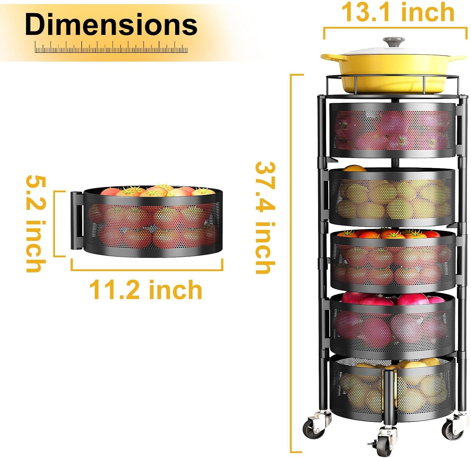 [Rotating Storage Rack] The rotating fruit basket is designed with 360° swivel wheels and 270° rotating basket, which is more convenient to take or place items from any direction. The high fence of 5.1″ protects the goods from falling down while increasing the storage space. Please watch our installation video before starting the assembly process, it will help you complete the assembly quickly and easily