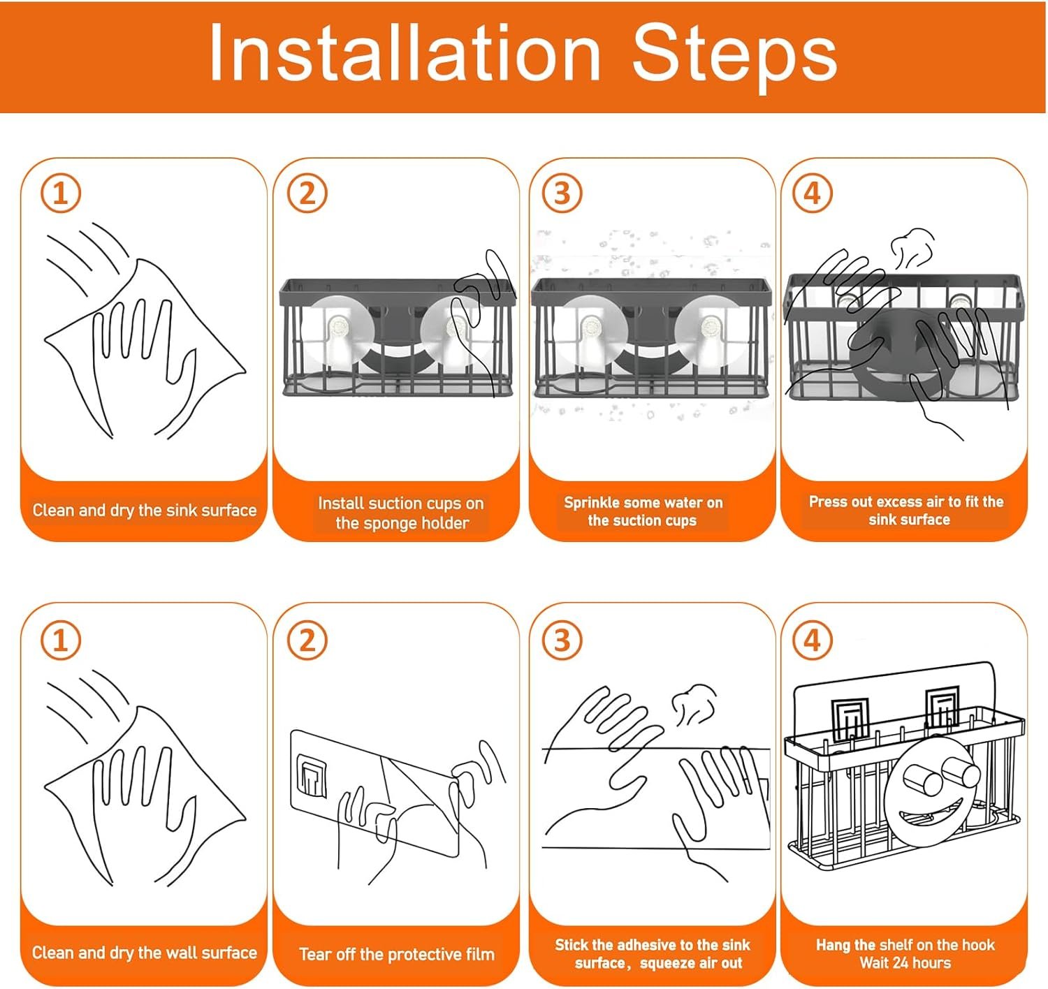 TWO DIFFERENT INSTALL METHODS: Our sponge caddy comes with 1 suction cup and 1 adhesive strip. Choose the method of installation based on your requirements. Applicable for kitchen walls ( smooth and neat), can also be applicable for in sink, smooth tiles/marble tiles/glass/metal walls and, etc