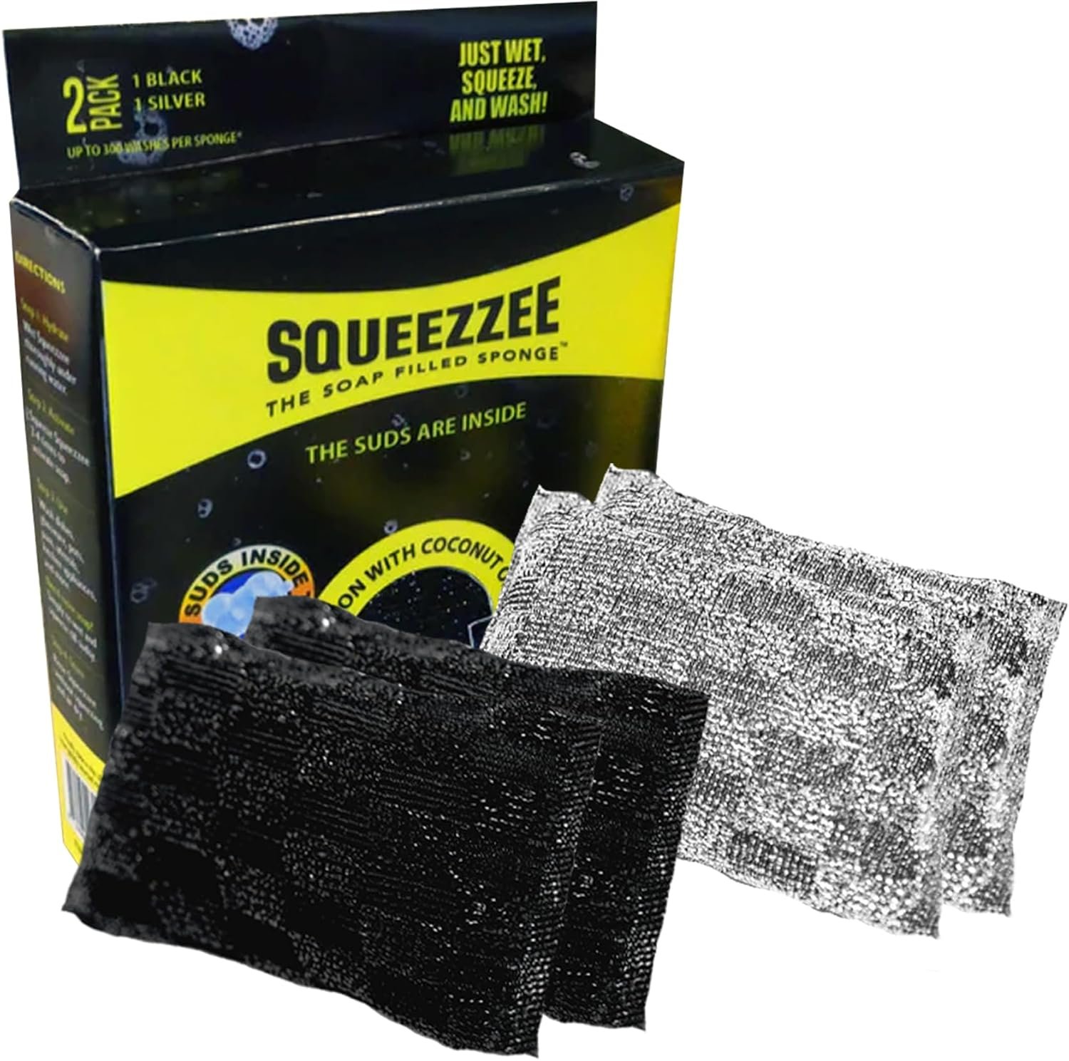 NO MORE TRIPS TO GET DISH SOAP: SQUEEZZEE is a soap-filled sponge that streamlines dishwashing and other scrubbing tasks. These scrub sponges are pre-filled with a grease-destroying, lemon-scented dish soap infused with natural coconut oils. This soap not only makes quick work of dirty dishes but will pamper your hands as you clean. No gloves needed!
