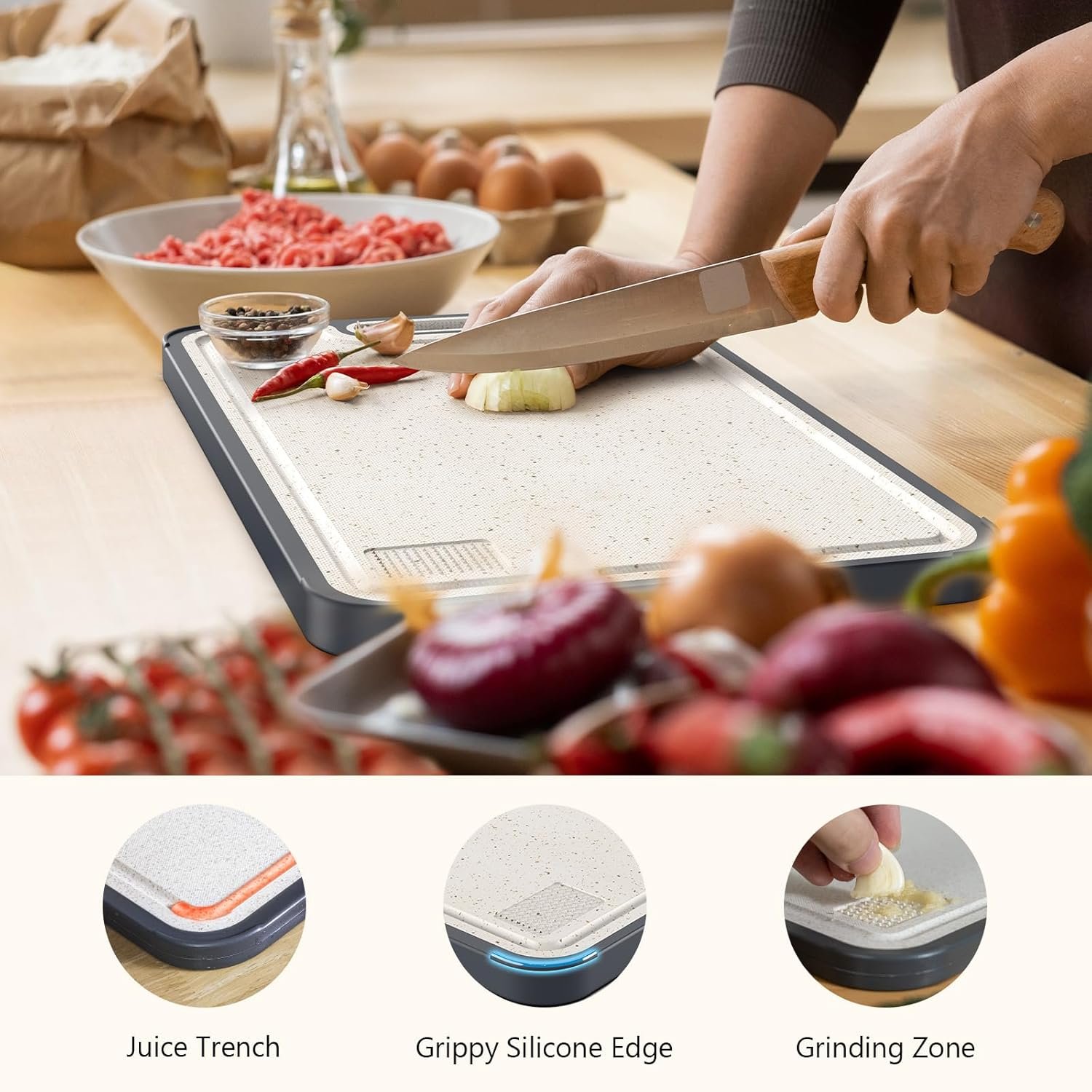 【Efficient Craftsmanship】The wheat straw PP side features a juice groove and garlic grinding area. The groove can hold a reasonable amount of liquid, preventing spills and allowing you to collect juices effortlessly. The grinding zone lets you quickly grind garlic and ginger, saving you time in the kitchen.