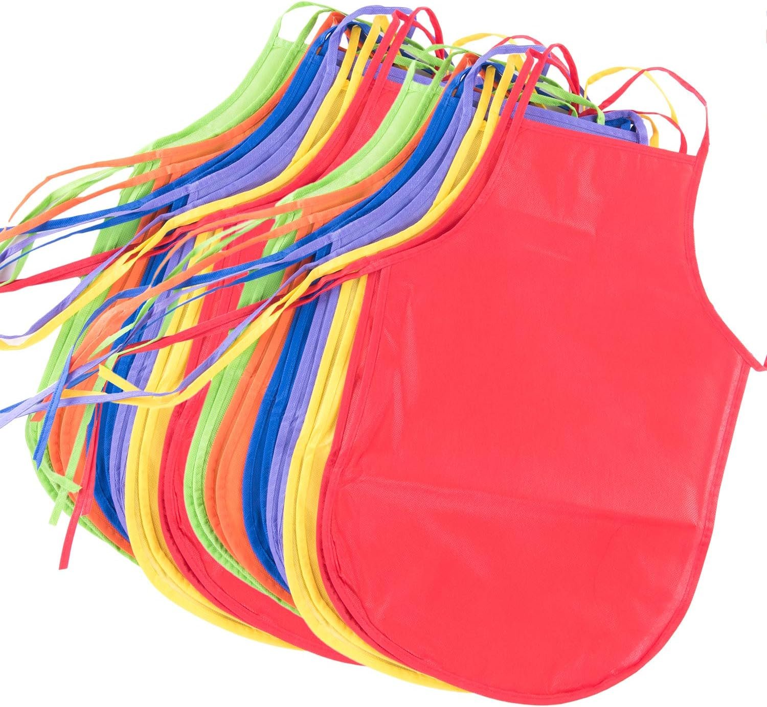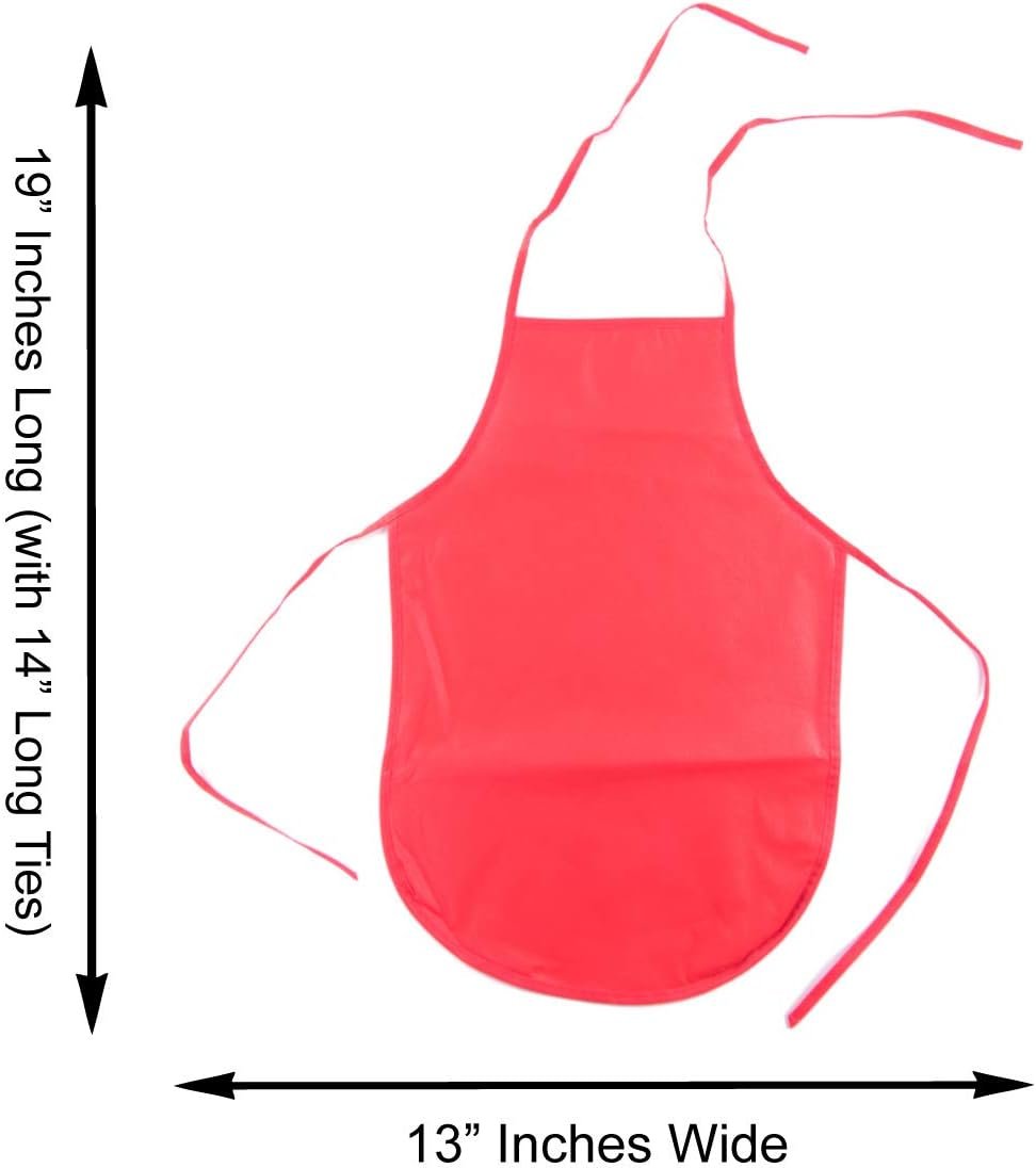 Durable high quality non-woven fabric aprons, each measuring at 13″ Wide x 19″ Length with 14″ Long ties. Comes in a package of 24 colorful aprons. Suitable for children aged 3 to 7 years. These vibrant aprons come in red, blue, purple, yellow, orange, and green.