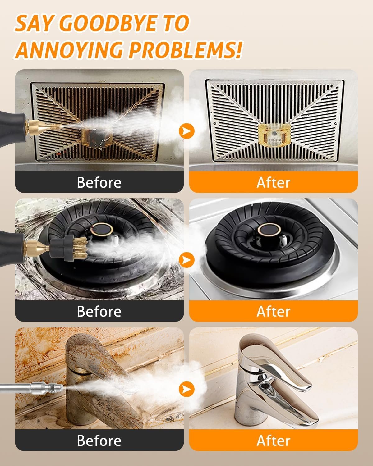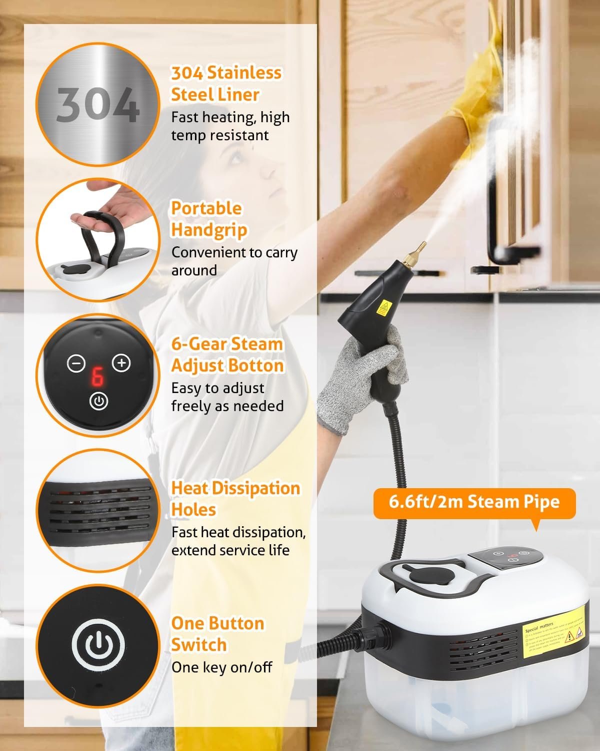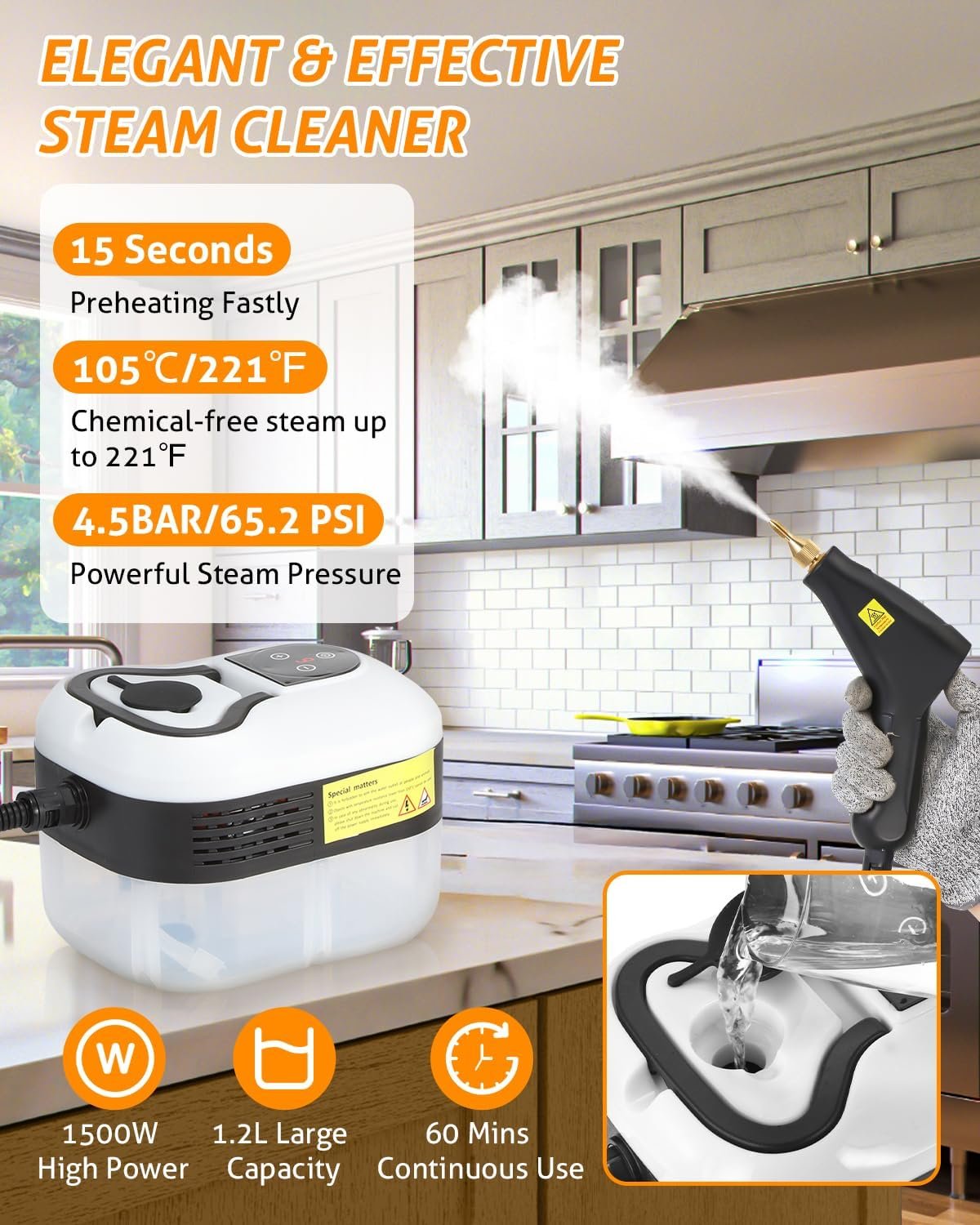 【Multi-purpose Steam Cleaner】Easily removes grease, dirt, and grime, it saves more water than traditional hand washing cleaning. Make your home cleaner and fresher than ever. 1500W electric handheld steam cleaner is widely used for cleaning sink, walls, countertop, cooktop, range hood, microwave oven, washing machine, refrigerator and more, widely applied in kitchen, bathroom, furniture, car, etc.